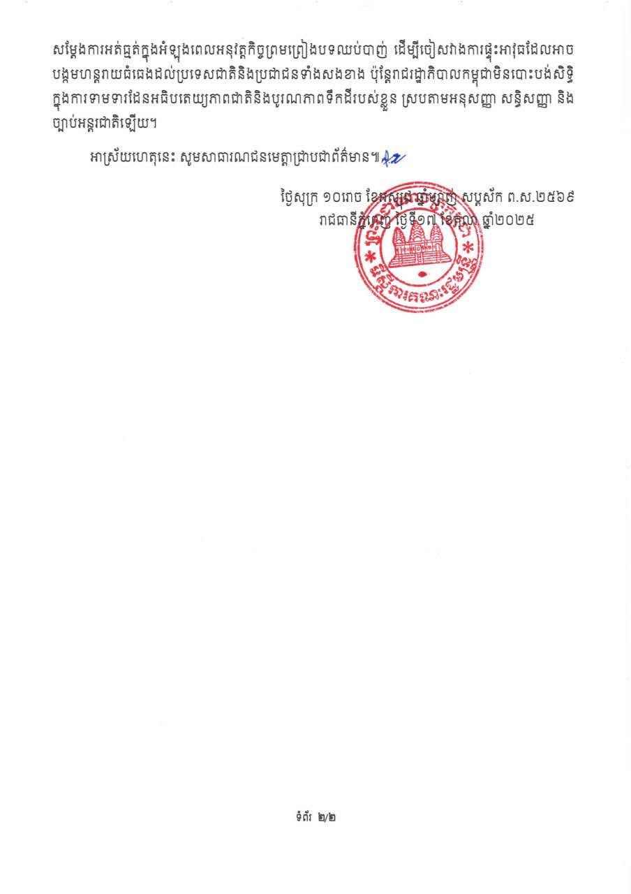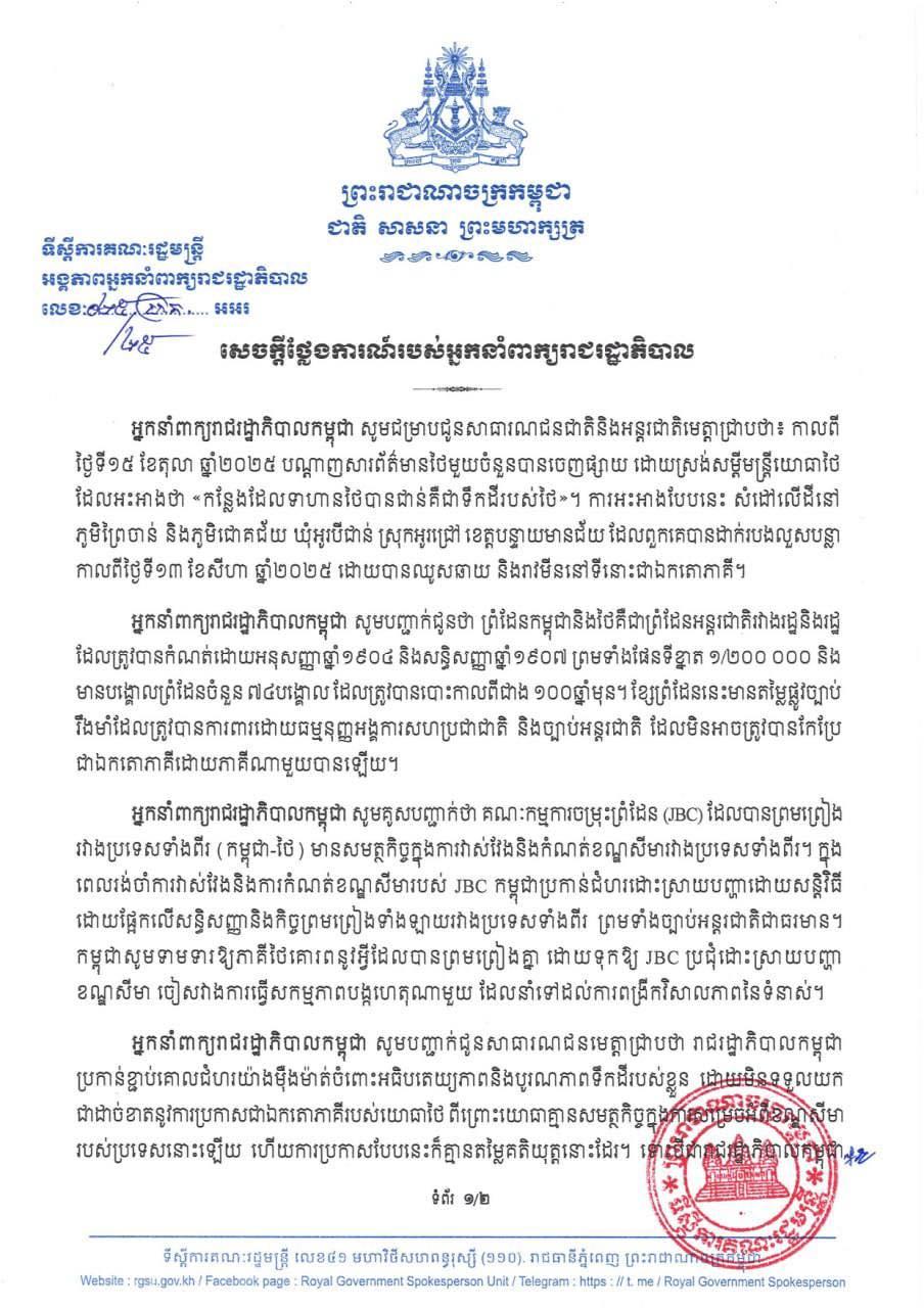 ភ្នំពេញ ៖ អ្នកនាំពាក្យរាជរដ្ឋាភិបាលកម្ពុជា នៅថ្ងៃទី១៧ ខែតុលា ឆ្នាំ២០២៥នេះ បានចេញសេចក្ដីថ្លែងការណ៍ទាត់ចោលនូវខ្លឹមសារដែលសារព័ត៌មានថៃ បានចុះផ្សាយដោយដកស្រង់សម្ដីរបស់មន្ដ្រីយោធាថៃថា «កន្លែងដែលទាហានថៃបានជាន់ គឺជាទឹកដីរបស់ថៃ»។
