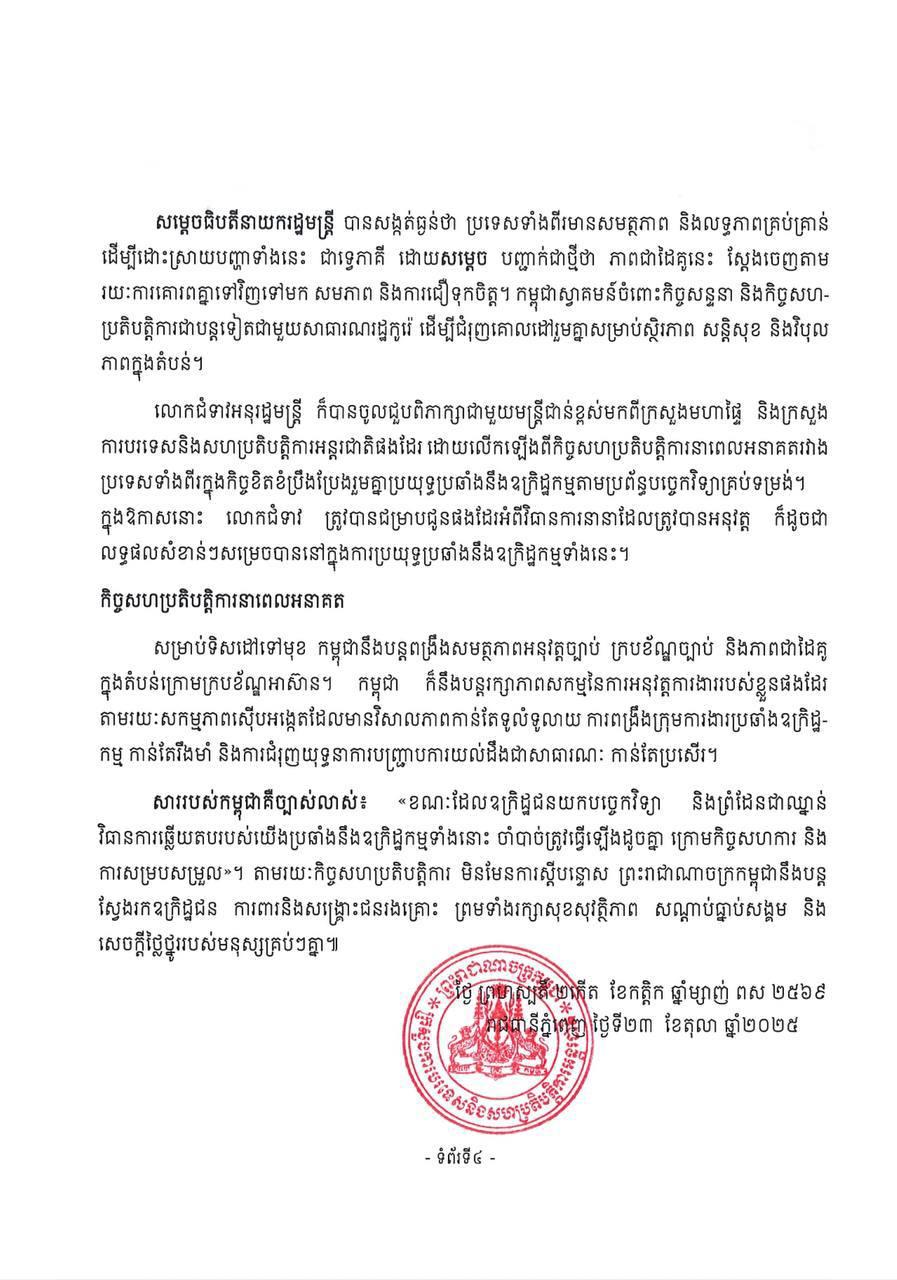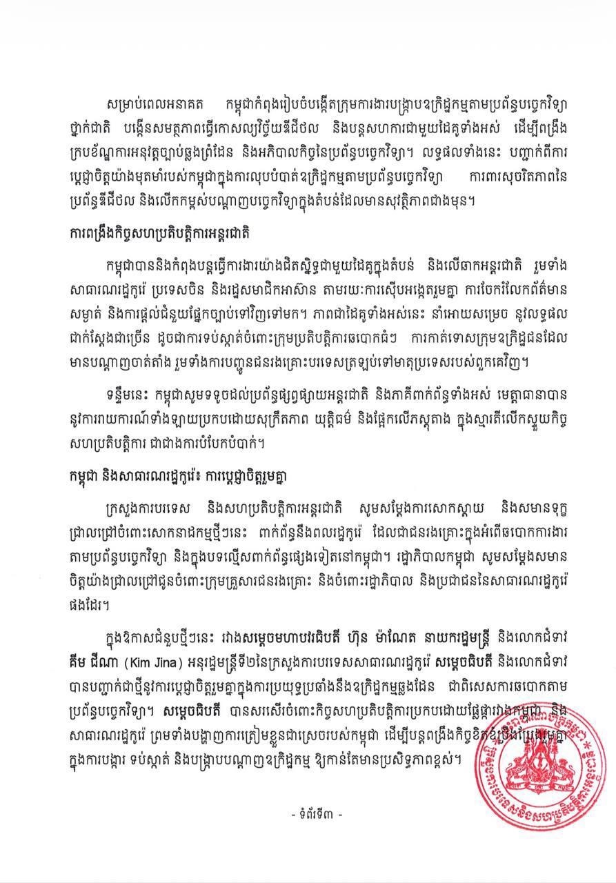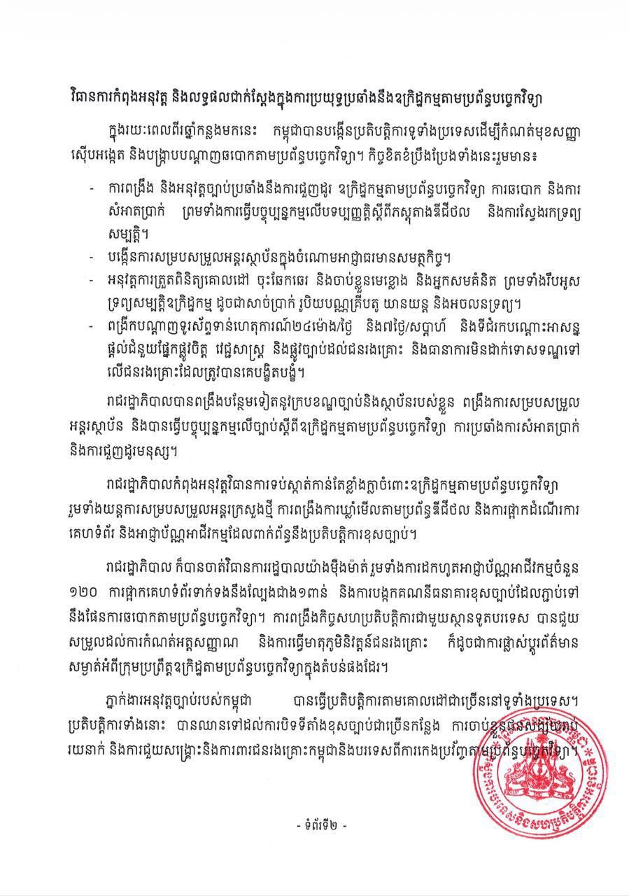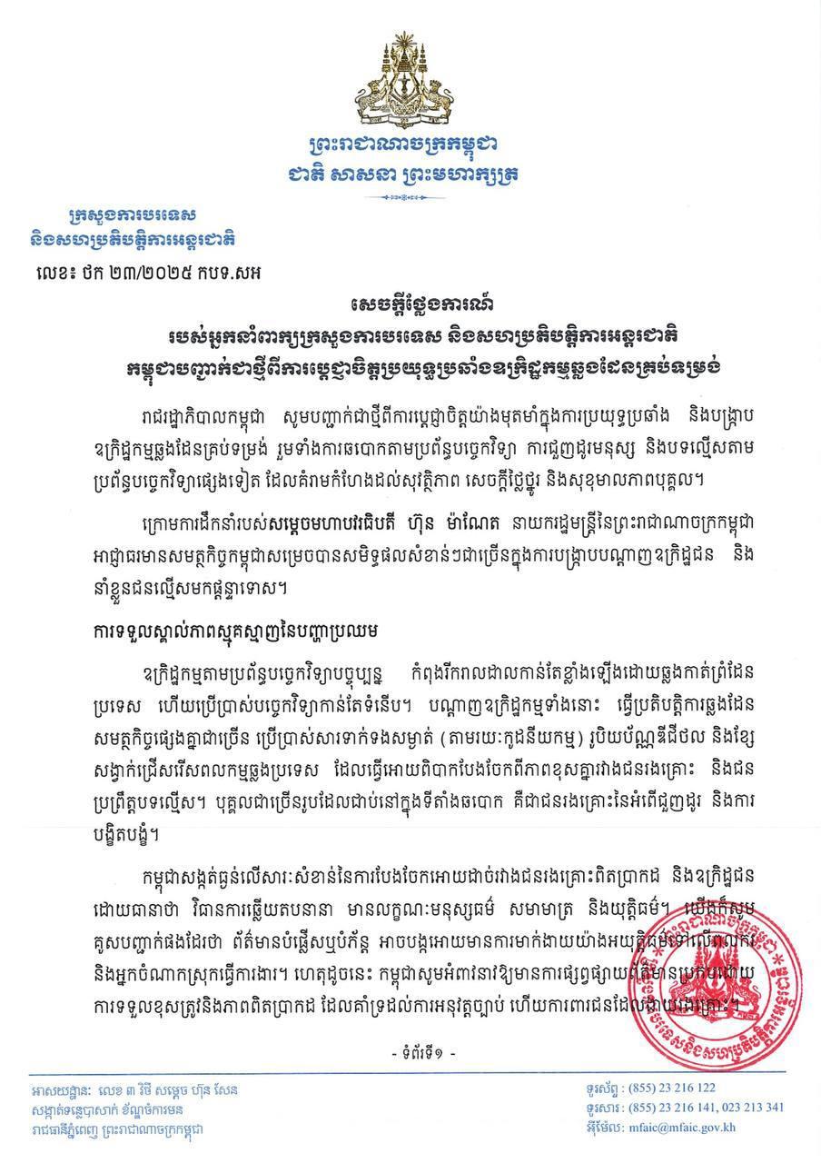ភ្នំពេញ ៖ រាជរដ្ឋាភិបាលកម្ពុជា សូមបញ្ជាក់ជាថ្មីពីការប្តេជ្ញាចិត្តយ៉ាងមុតមាំក្នុងការប្រយុទ្ធប្រឆាំង និងបង្ក្រាប ឧក្រិដ្ឋកម្មឆ្លងដែនគ្រប់ទម្រង់ រួមទាំងការឆបោកតាមប្រព័ន្ធបច្ចេកវិទ្យា ការជួញដូរមនុស្ស និងបទល្មើសតាម ប្រព័ន្ធបច្ចេកវិទ្យាផ្សេងទៀត ដែលគំរាមកំហែងដល់សុវត្ថិភាព សេចក្តីថ្លៃថ្នូរ និងសុខុមាលភាពបុគ្គល។ នេះតាមសេចក្តីថ្លែងការណ៍របស់អ្នកនាំពាក្យក្រសួងការបរទេស និងសហប្រតិបត្តិការអន្តរជាតិ នៅថ្ងៃទី២៣ ខែតុលា ឆ្នាំ២០២៥។