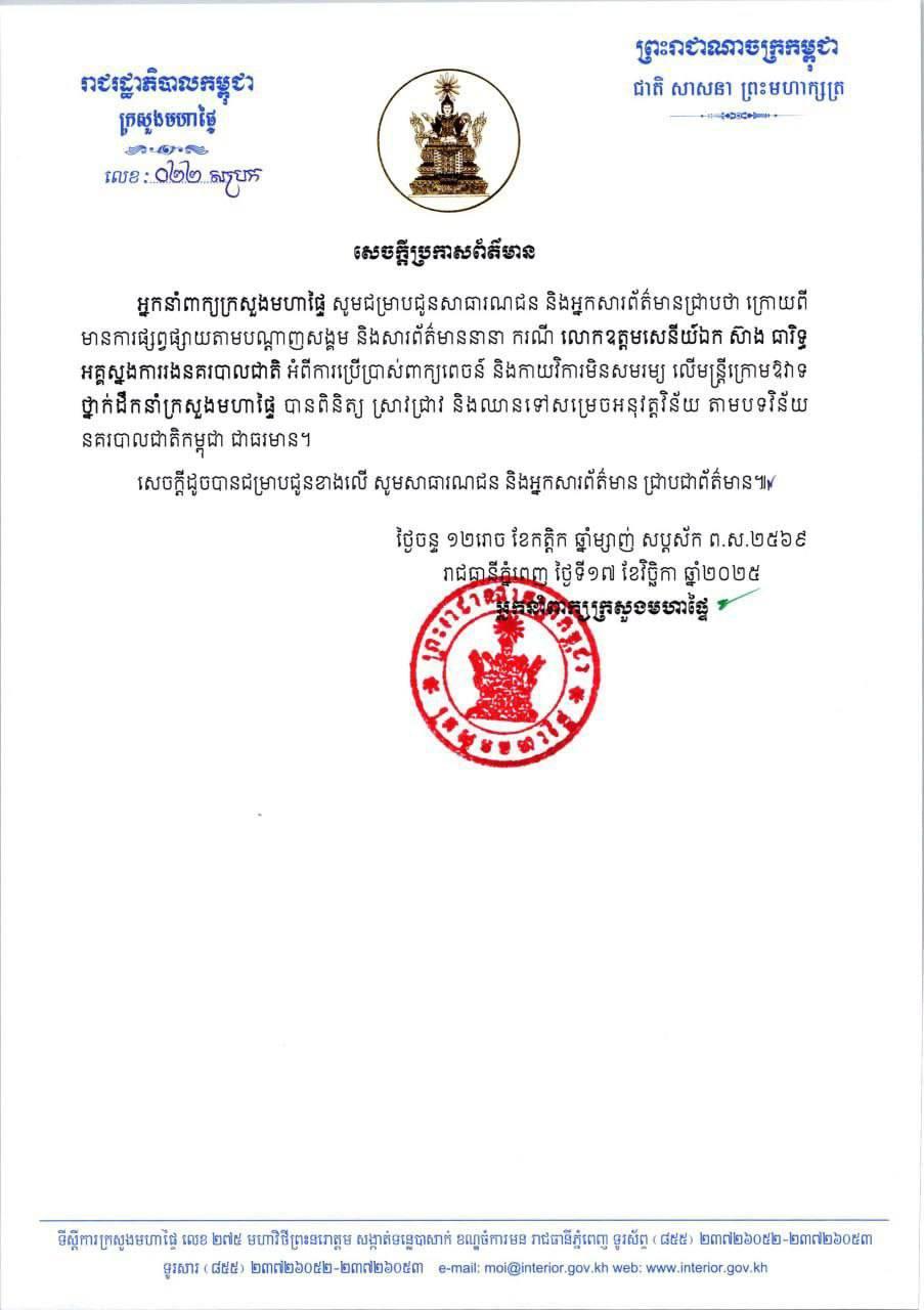 ថ្នាក់ដឹកនាំក្រសួងមហាផ្ទៃ បានស្រាវជ្រាវ និងឈានទៅសម្រេចអនុវត្តវិន័យចំពោះ ឧត្តមសេនីយ៍ឯក ស៊ាង ធារិទ្ធ បន្ទាប់ពីប្រើប្រាស់ពាក្យពេចន៍មិនសមរម្យ