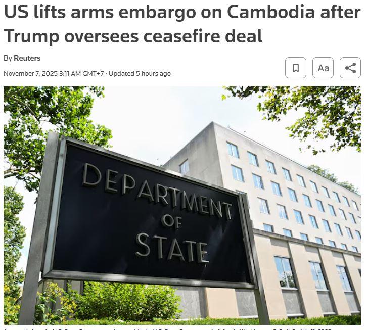 សហរដ្ឋអាមេរិក កាលពីថ្ងៃព្រហស្បតិ៍ បានលុបចោលការហាមឃាត់ពាណិជ្ជកម្មផ្នែកការពារជាតិទៅលើប្រទេសកម្ពុជា បន្ទាប់ពីលោកប្រធានាធិបតី ដូណាល់ ត្រាំ បាន ត្រួតពិនិត្យលើការចុះហត្ថលេខាលើកិច្ចព្រមព្រៀងបទឈប់បាញ់ រវាងប្រទេសអាស៊ីអាគ្នេយ៍មួយនេះ និងប្រទេសជិតខាងគឺប្រទេសថៃ កាលពីសប្តាហ៍មុន។