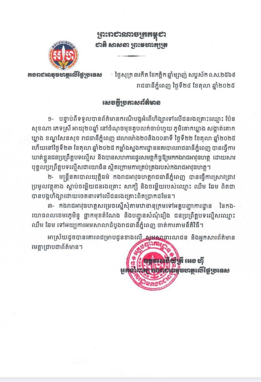 ភ្នំពេញ ៖ «កងរាជអាវុធហត្ថសម្រេចស្នើសុំតាមឋានានុក្រមទៅអគ្គបញ្ជាការដ្ឋាន នៃកងយោធពលខេមរភូមិន្ទ ផ្អាកមុខតំណែង និងបញ្ជូនសំណុំរឿងជនប្រព្រឹត្តបទល្មើសឈ្មោះ ឈឹម ឆែម ទៅអយ្យការអមសាលាដំបូងរាជធានីភ្នំពេញ»។