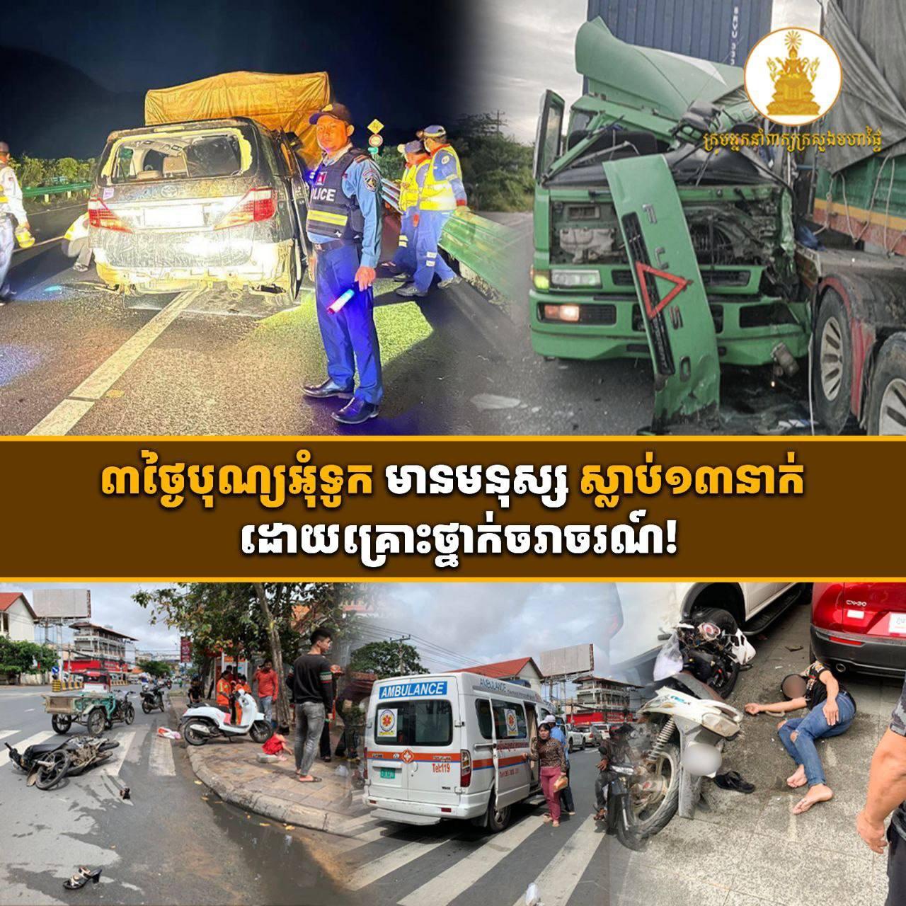 ភ្នំពេញ ៖ ក្នុងរយៈពេល ៣ថ្ងៃ នៃព្រះរាជពិធីបុណ្យអុំទូក បណ្តែតប្រទីប និងសំពះព្រះខែ អកអំបុក គិតចាប់ពីថ្ងៃទី៤ ដល់ថ្ងៃទី៦ ខែវិច្ឆិកា ឆ្នាំ២០២៥ នៅទូទាំង ប្រទេសកម្ពុជា មានហេតុការណ៍គ្រោះថ្នាក់ចរាចរណ៍ផ្លូវគោគកើតឡើងចំនួន២៦ករណី បណ្តាលឱ្យមានមនុស្សស្លាប់ចំនួន១៣នាក់ និងរងរបួសធ្ងន់ស្រាល៣៣នាក់។ នេះបើតាម លោក ទូច សុឃៈ អ្នកនាំពាក្យរងក្រសួងមហាផ្ទៃ។