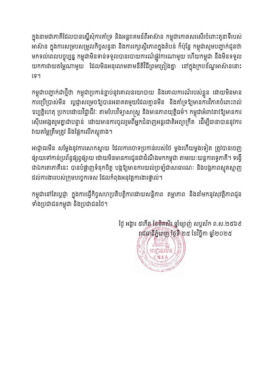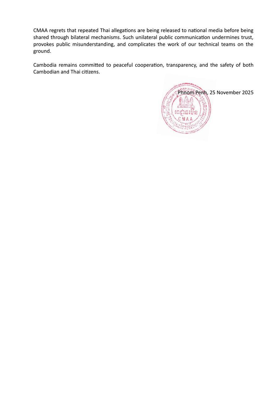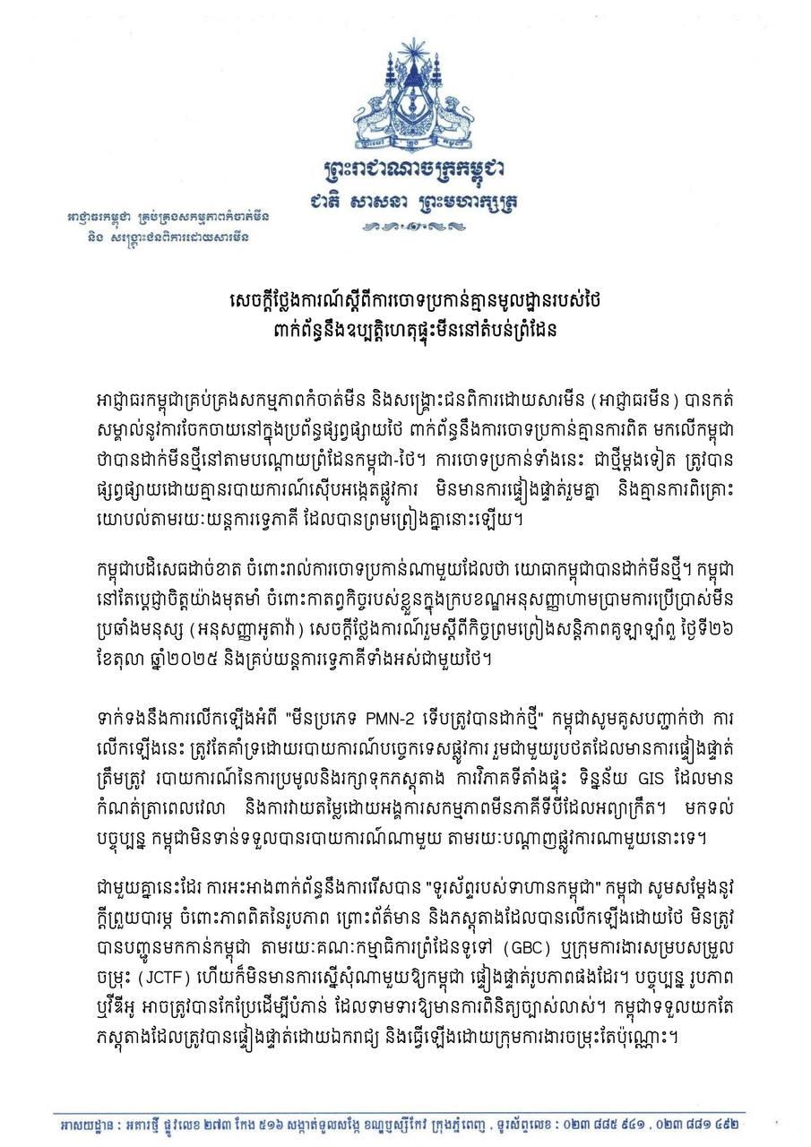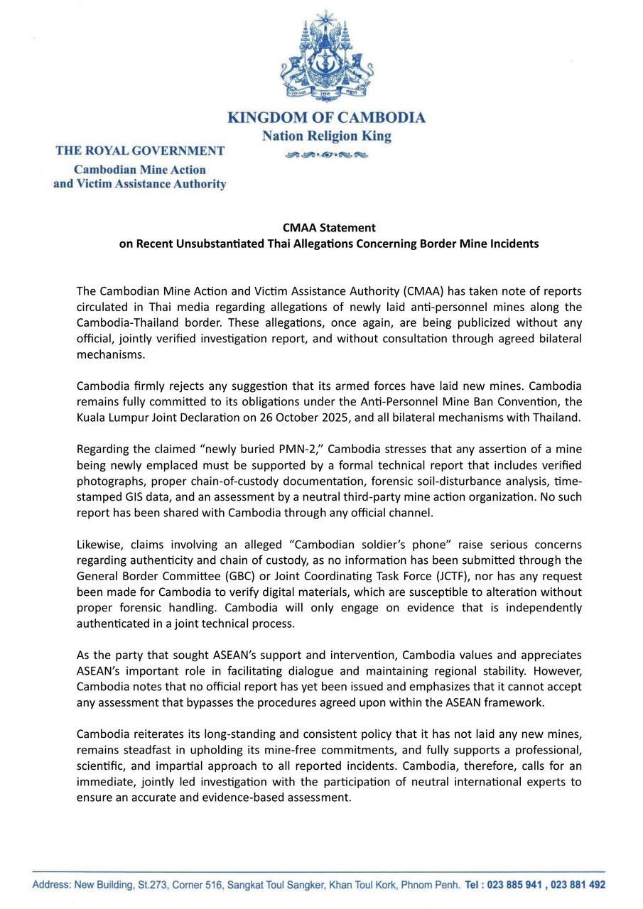 កម្ពុជាបដិសេធដាច់ខាត ចំពោះរាល់ការចោទប្រកាន់ណាមួយដែលថា យោធាកម្ពុជាបានដាក់មីនថ្មី។ កម្ពុជា នៅតែប្តេជ្ញាចិត្តយ៉ាងមុតមាំ ចំពោះកាតព្វកិច្ចរបស់ខ្លួនក្នុងក្របខណ្ឌអនុសញ្ញាហាមប្រាមការប្រើប្រាស់មីន ប្រឆាំងមនុស្ស (អនុសញ្ញាអូតាវ៉ា) សេចក្ដីថ្លែងការណ៍រួមស្ដីពីកិច្ចព្រមព្រៀងសន្តិភាពគូឡាឡាំពួ ថ្ងៃទី២៦ ខែតុលា ឆ្នាំ២០២៥ និងគ្រប់យន្តការទ្វេភាគីទាំងអស់ជាមួយថៃ៕