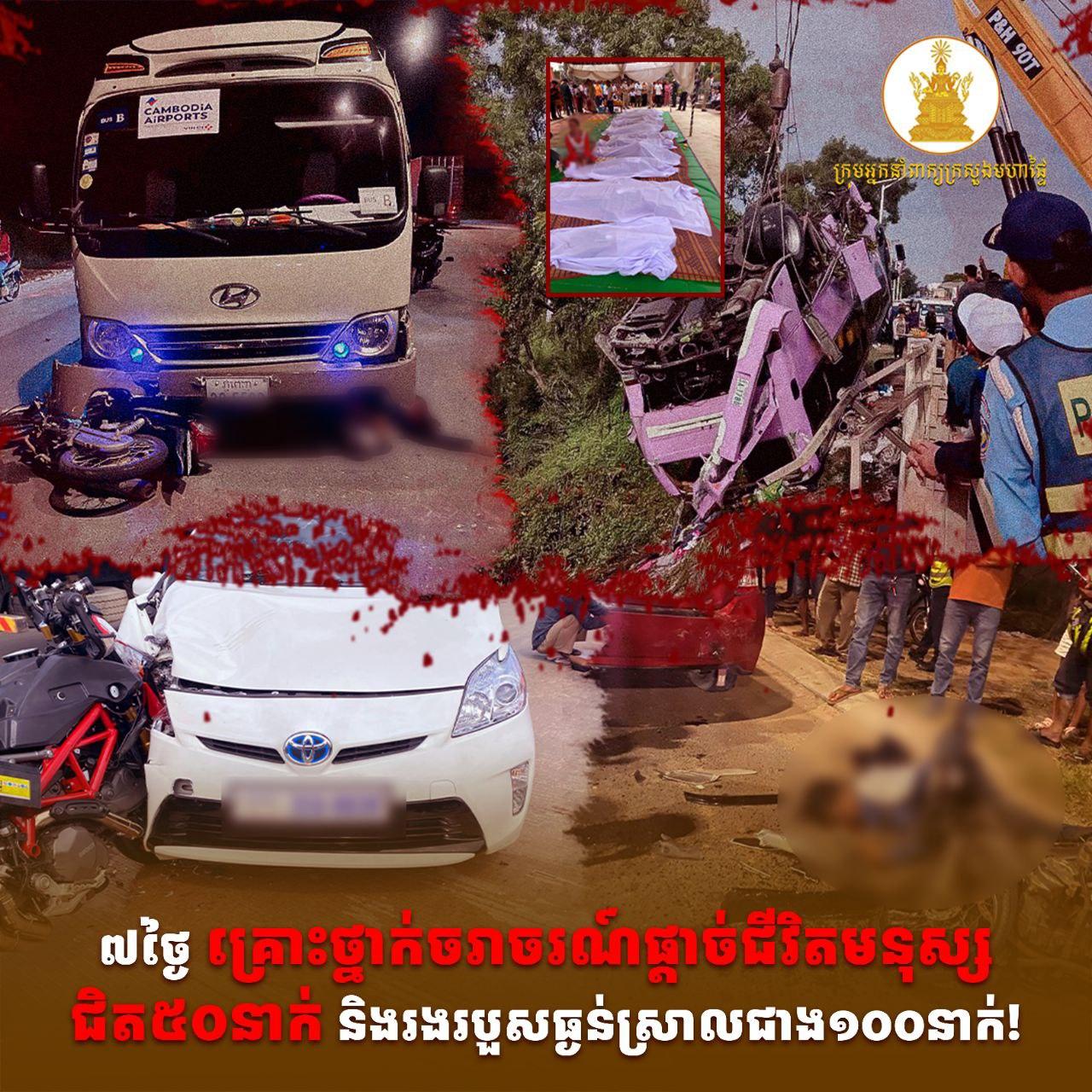 បើតាម អ្នកនាំពាក្យរង ករណីគ្រោះថ្នាក់ចរាចរណ៍នោះ រួមមាន នៅថ្ងៃទី១៧ វិច្ឆិកា មាន៨ករណី ស្លាប់៥នាក់ របួស៩នាក់ ថ្ងៃទី១៨ មាន៧ករណី ស្លាប់១នាក់ របួស៩នាក់ ថ្ងៃទី១៩ មាន១៤ករណី ស្លាប់៥នាក់ របួស២៥នាក់ ថ្ងៃទី២០ មាន១៤ករណី ស្លាប់១៩នាក់ របួស៤២នាក់ ថ្ងៃទី២១ មាន៩ករណី ស្លាប់៧នាក់ របួស១៤នាក់ ថ្ងៃទី២២ មាន៧ករណី ស្លាប់២នាក់ របួស១០នាក់ និងថ្ងៃទី២៣ វិច្ឆិកា មាន១០ករណី ស្លាប់៥នាក់ របួស១១នាក់។