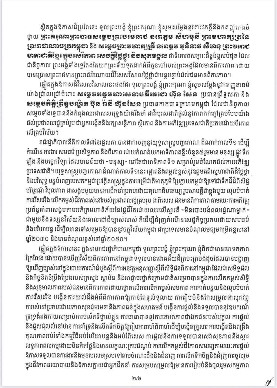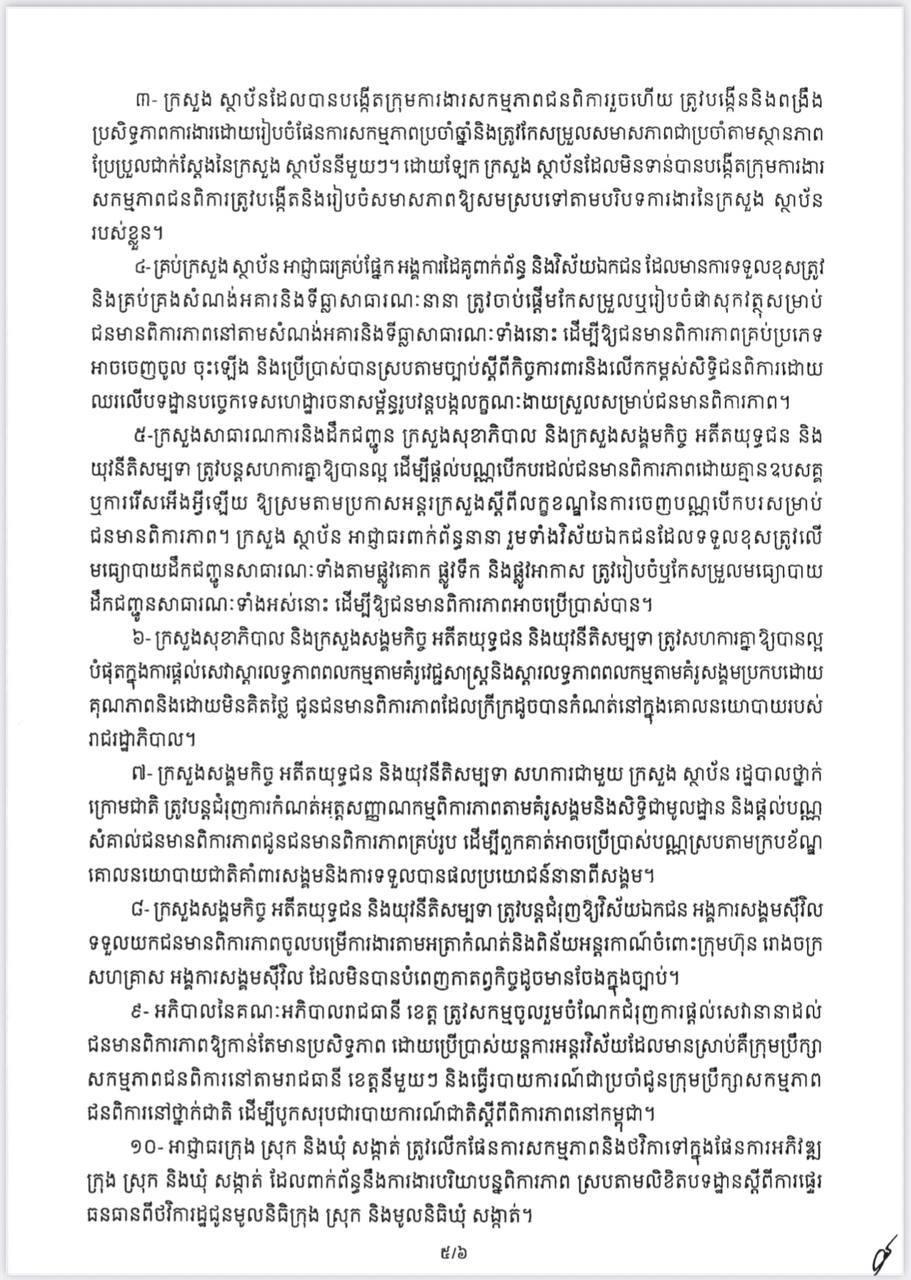 សម្ដេចធិបតី បានគូសបញ្ជាក់ថា «ហេតុនេះសរុបទាំងក្រសួង ស្ថាប័នសាធារណៈ និងវិស័យឯកជននៅទូទាំងប្រទេសបានទទួល យកជនមានពិការភាពតាមអត្រាកំណត់នៃច្បាប់សរុបចំនួន១៤ ៤០៧នាក់ ឱ្យបម្រើការងារដោយទទួលបាន ប្រាក់ចំណូលនិងអត្ថប្រយោជន៍សង្គម ទៅតាមមុខតំណែង តួនាទី និងការងារ ស្របតាមសមត្ថភាព និងទេពកោសល្យរៀងៗខ្លួន»។