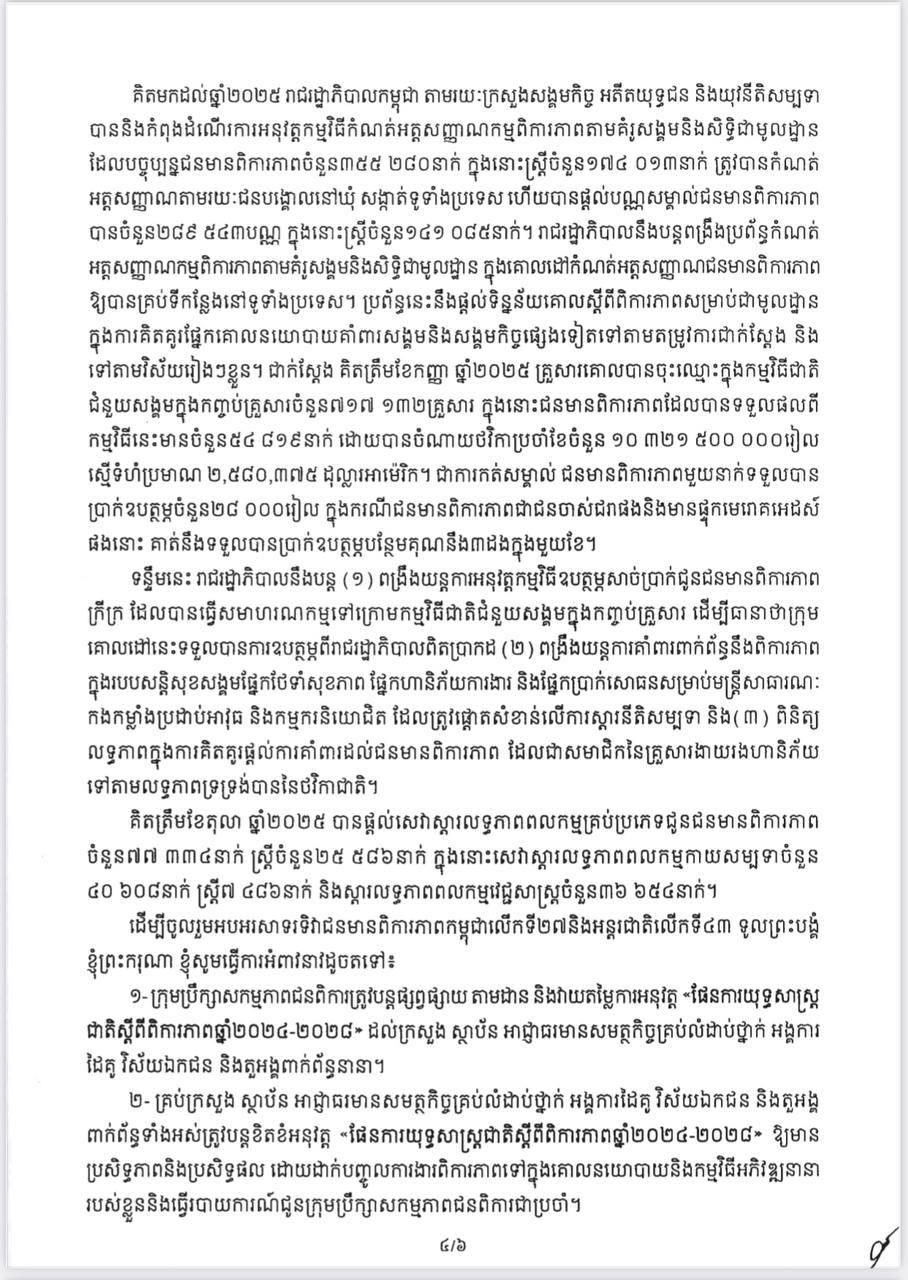 សូមរំលឹកថា គិតមកដល់ឆ្នាំ២០២៥ រាជរដ្ឋាភិបាលកម្ពុជា តាមរយៈក្រសួងសង្គមកិច្ច អតីតយុទ្ធជន និងយុវនីតិសម្បទា បាននិងកំពុងដំណើរការអនុវត្តកម្មវិធីកំណត់អត្តសញ្ញាណកម្មពិការភាពតាមគំរូសង្គម និងសិទ្ធិជាមូលដ្ឋាន ដែលបច្ចុប្បន្នជនមានពិការភាពចំនួន៣៥៥ ២៨០នាក់ ក្នុងនោះ ស្ត្រី ចំនួន១៧៤ ០១៣នាក់ ត្រូវបានកំណត់អត្តសញ្ញាណតាមរយៈជនបង្គោលនៅឃុំ សង្កាត់ទូទាំងប្រទេស ហើយបានផ្តល់បណ្ណសម្គាល់ជនមានពិការភាព បានចំនួន២៨៩ ៥៤៣បណ្ណ ក្នុងនោះស្ត្រីចំនួន ១៤១ ០៨៥នាក់៕