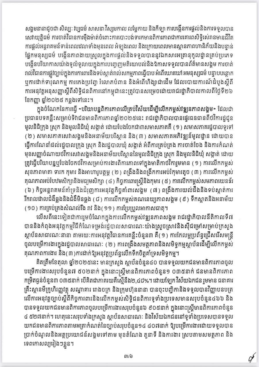 យោងសារលិខិតរបស់ សម្តេចធិបតី ហ៊ុន ម៉ាណែត ក្នុងឱកាសទិវាជនមានពិការភាពកម្ពុជាលើកទី២៧ និងអន្តរជាតិលើកទី៤៣ ក្រោមប្រធានបទ «បរិយាបន្នពិការភាពលើគ្រប់វិស័យដើម្បីលើកកម្ពស់វឌ្ឍនភាពសង្គម» ថ្ងៃទី ៣ ខែធ្នូ ឆ្នាំ ២០២៥ សម្ដេចធិបតី បានលើកឡើងថា គិតត្រឹមខែតុលា ឆ្នាំ២០២៥នេះ មានក្រសួង ស្ថាប័នចំនួន៤០ បានទទួលយកជនមានពិការភាពចូលបម្រើការងារសរុបចំនួន៧ ៥០២នាក់ ក្នុងនោះ ស្ត្រីមានពិការភាពចំនួន១ ០៣៥នាក់ ជនមានពិការភាពកម្រិតធ្ងន់ចំនួន៣ ០៣៥នាក់ បើគិតជាភាគរយគឺស្មើនឹង២,៤៨%។