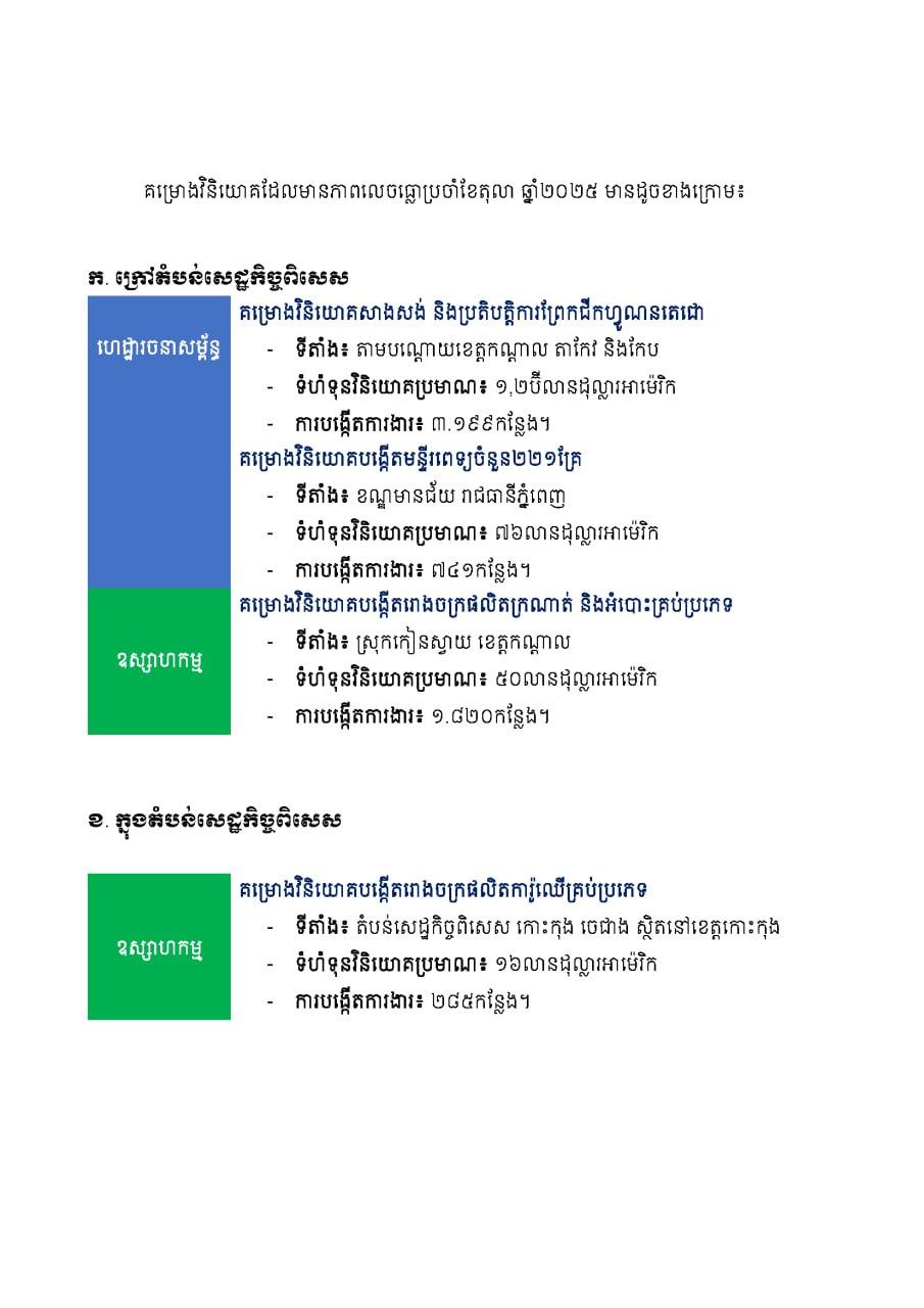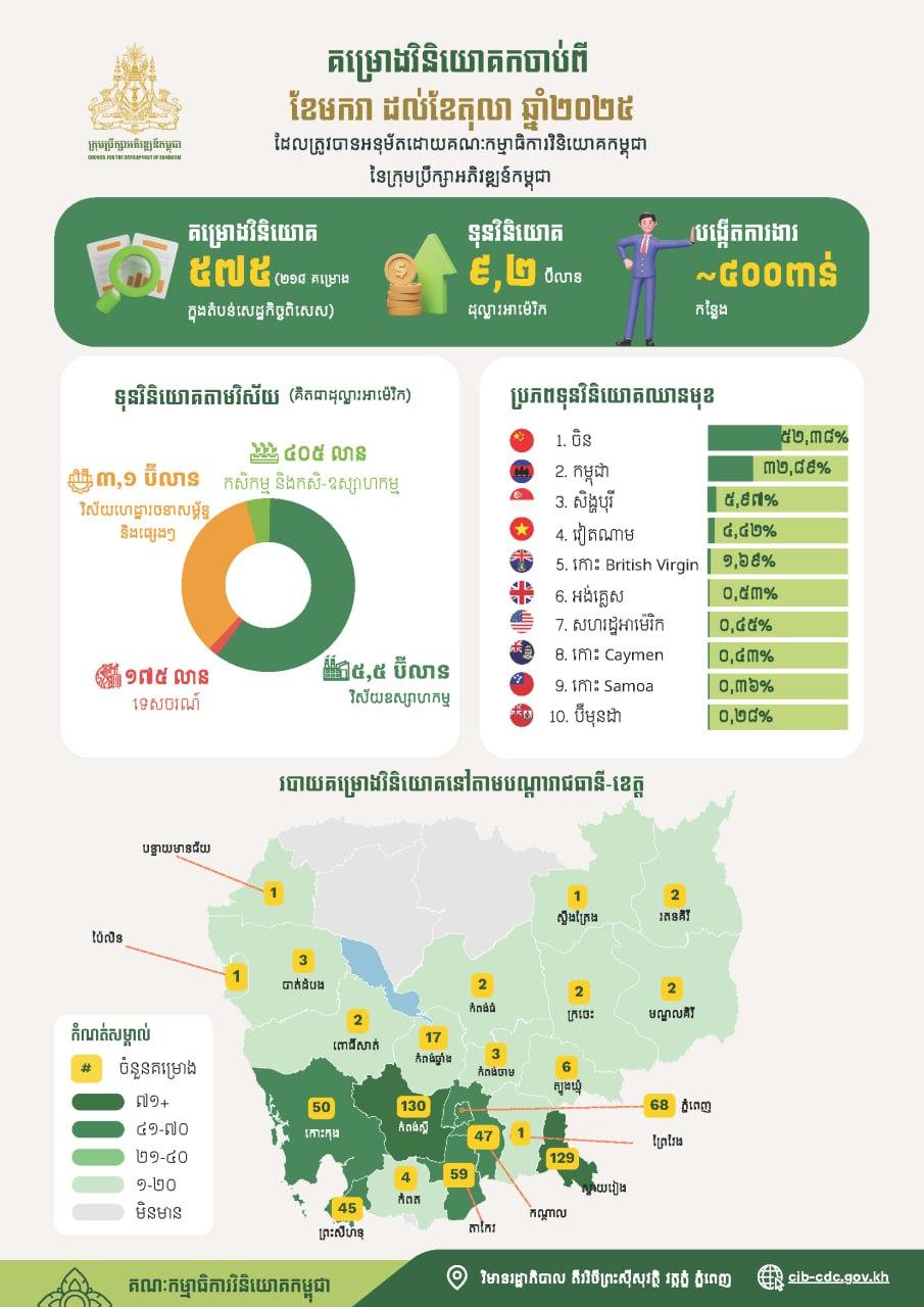 ដោយឡែកសម្រាប់តែខែតុលា ឆ្នាំ២០២៥ គម្រោងវិនិយោគចំនួន២៩ ក្នុងទំហំទុនវិនិយោគសរុបប្រមាណ ១.៤ប៊ីលានដុល្លារអាម៉េរិក ត្រូវបានចុះបញ្ជីដោយគណៈកម្មាធិការវិនិយោគកម្ពុជានៃក្រុមប្រឹក្សាអភិវឌ្ឍន៍កម្ពុជា៕