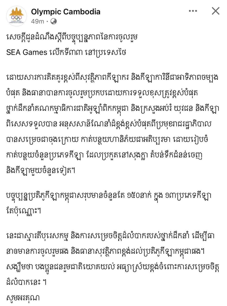 គណៈកម្មាធិការជាតិអូឡាំពិកកម្ពុជាសូមថ្លែងអំណរគុណយ៉ាងស្មោះស្ម័គ្រចំពោះសហព័ន្ធកីឡាអាស៊ីអាគ្នេយ៍ (SEAGF) ដែលបានបន្តដឹកនាំរបស់ខ្លួន និងគណៈកម្មាធិការរៀបចំស៊ីហ្គេមរបស់ប្រទេសថៃ (THASOC) ចំពោះការប្តេជ្ញាចិត្ត និងការខិតខំប្រឹងប្រែងយ៉ាងមុតមាំក្នុងការរៀបចំការប្រកួតកីឡាស៊ីហ្គេម។ NOCC ជូនដំណឹងជាផ្លូវការដល់ SEAGF ថា កម្ពុជានឹងចូលរួមប្រកួតតែលើ១៣ប្រភេទកីឡា ដោយសម្រេចដកខ្លួនចេញពីការប្រកួតចំនួន ៨ប្រភេទកីឡា។