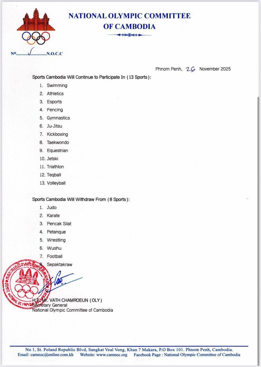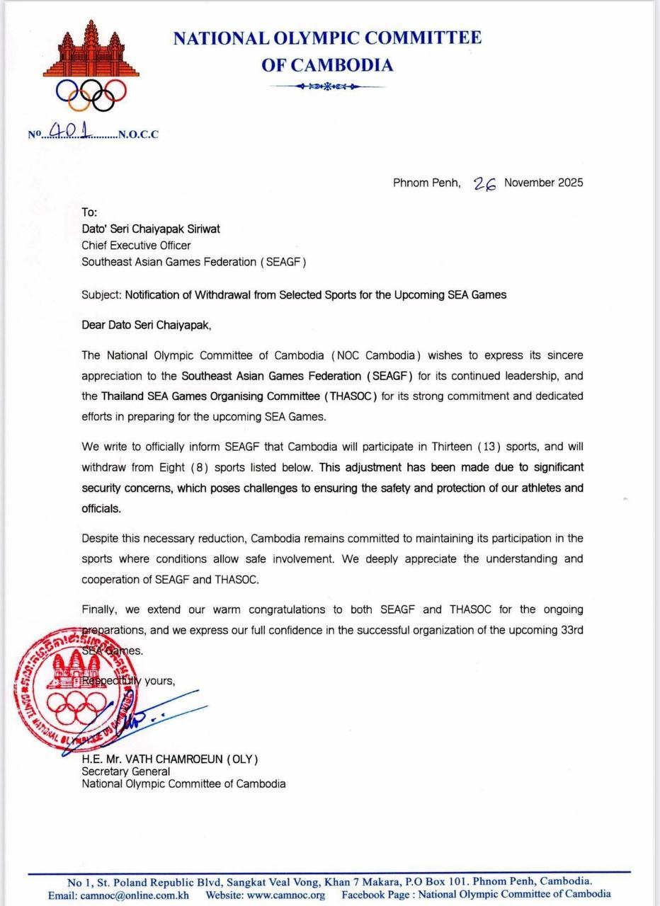 នៅក្នុងលិខិតផ្លូវការមួយ ចុះថ្ងៃទី២៦ ខែវិច្ឆិកា ឆ្នាំ២០២៥ ផ្ញើជូនលោក Dato' Seri Chaiyapak Siriwat នាយកប្រតិបត្តិ សហព័ន្ធកីឡាអាស៊ីអាគ្នេយ៍ (SEAGF) ឯកឧត្តម វ៉ាត់ ចំរើន អគ្គលេខាធិការ NOCC បានបញ្ជាក់ពីការជូនដំណឹងអំពីការដកខ្លួនចេញប្រភេទកីឡាចំនួន៨របស់កម្ពុជា ក្នុងការប្រកួតកីឡាស៊ីហ្គេម លើកទី៣៣ នៅប្រទេសថៃ ពីថ្ងៃទី០៩-២០ ខែវិច្ឆិកា ឆ្នាំ២០២៥។