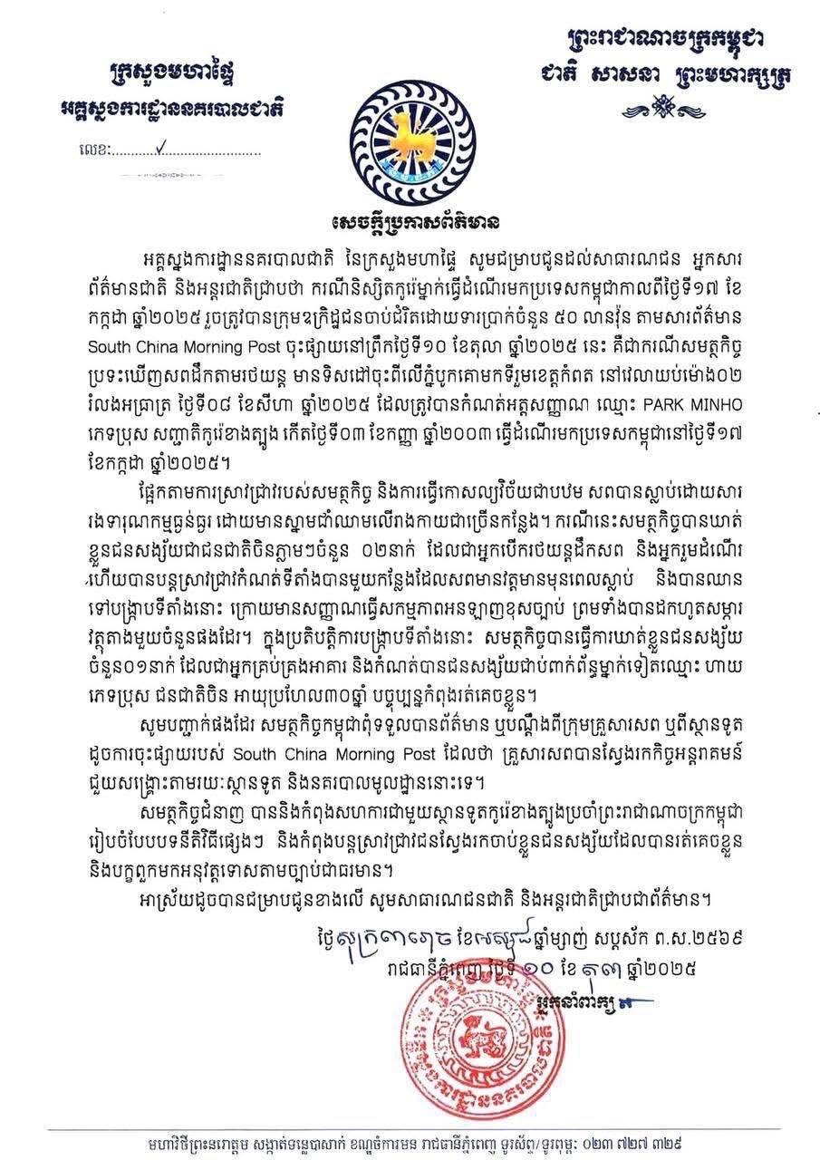 យោងតាមសេចក្ដីប្រកាសព័ត៌មាន អគ្គស្នងការដ្ឋាននគរបាលជាតិ បានបញ្ជាក់ថាករណីនិស្សិតកូរ៉េម្នាក់ធ្វើដំណើរមកប្រទេសកម្ពុជា កាលពីថ្ងៃទី១៧ ខែកក្កដា ឆ្នាំ២០២៥ រួចត្រូវបានក្រុមឧក្រិដ្ឋជនចាប់ជំរិត ដោយទារប្រាក់ចំនួន៥០លានវ៉ុន តាមសារព័ត៌មាន South China Morning Post ចុះផ្សាយនៅព្រឹកថ្ងៃទី១០ ខែតុលា ឆ្នាំ២០២៥នេះ គឺជាករណីសមត្ថកិច្ច ប្រទះឃើញសពដឹកតាមរថយន្ត មានទិសដៅចុះពីលើភ្នំបូកគោ មកទីរួមខេត្តកំពត នៅវេលាយប់ម៉ោង២ រំលងអធ្រាត្រ ថ្ងៃទី៨ ខែសីហា ឆ្នាំ២០២៥ ដែលត្រូវបានកំណត់អត្តសញ្ញាណ ឈ្មោះ PARK MINHO ភេទប្រុស សញ្ជាតិកូរ៉េខាងត្បូង កើតថ្ងៃទី៣ ខែកញ្ញា ឆ្នាំ២០០៣ ធ្វើដំណើរមកប្រទេសកម្ពុជា នៅថ្ងៃទី១៧ ខែកក្កដា ឆ្នាំ២០២៥។