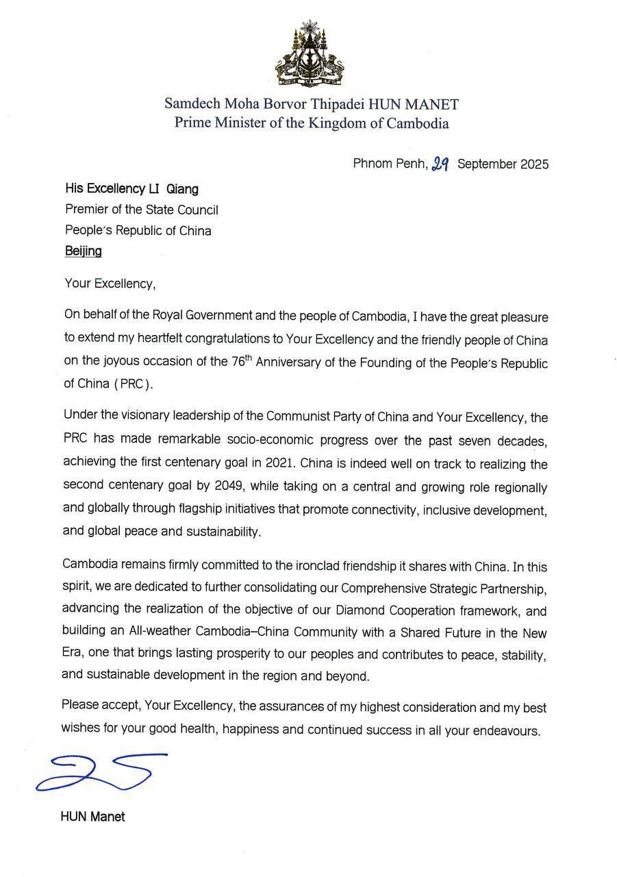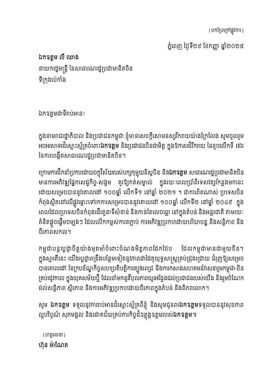 ការលើកឡើងនេះ តាមរយៈសារលិខិតអបអរសាទររបស់ នាយករដ្ឋមន្ត្រី នៃកម្ពុជា ផ្ញេីជូន លោក លី ឈាង នាយករដ្ឋមន្ត្រីចិន ក្នុងឱកាសដ៏រីករាយ នៃខួបលើកទី ៧៦ នៃការបង្កើតសាធារណរដ្ឋប្រជាមានិតចិន។