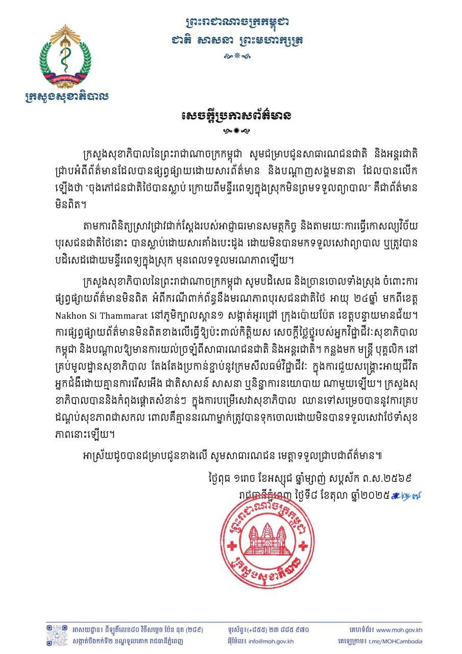 ក្រសួងសុខាភិបាល ច្រានចោលព័ត៌មានមិនពិត បានផ្សព្វផ្សាយថា «ចុងភៅជនជាតិថៃបានស្លាប់ ក្រោយពីមន្ទីរពេទ្យក្នុងស្រុកមិនព្រមទទួលព្យាបាល»