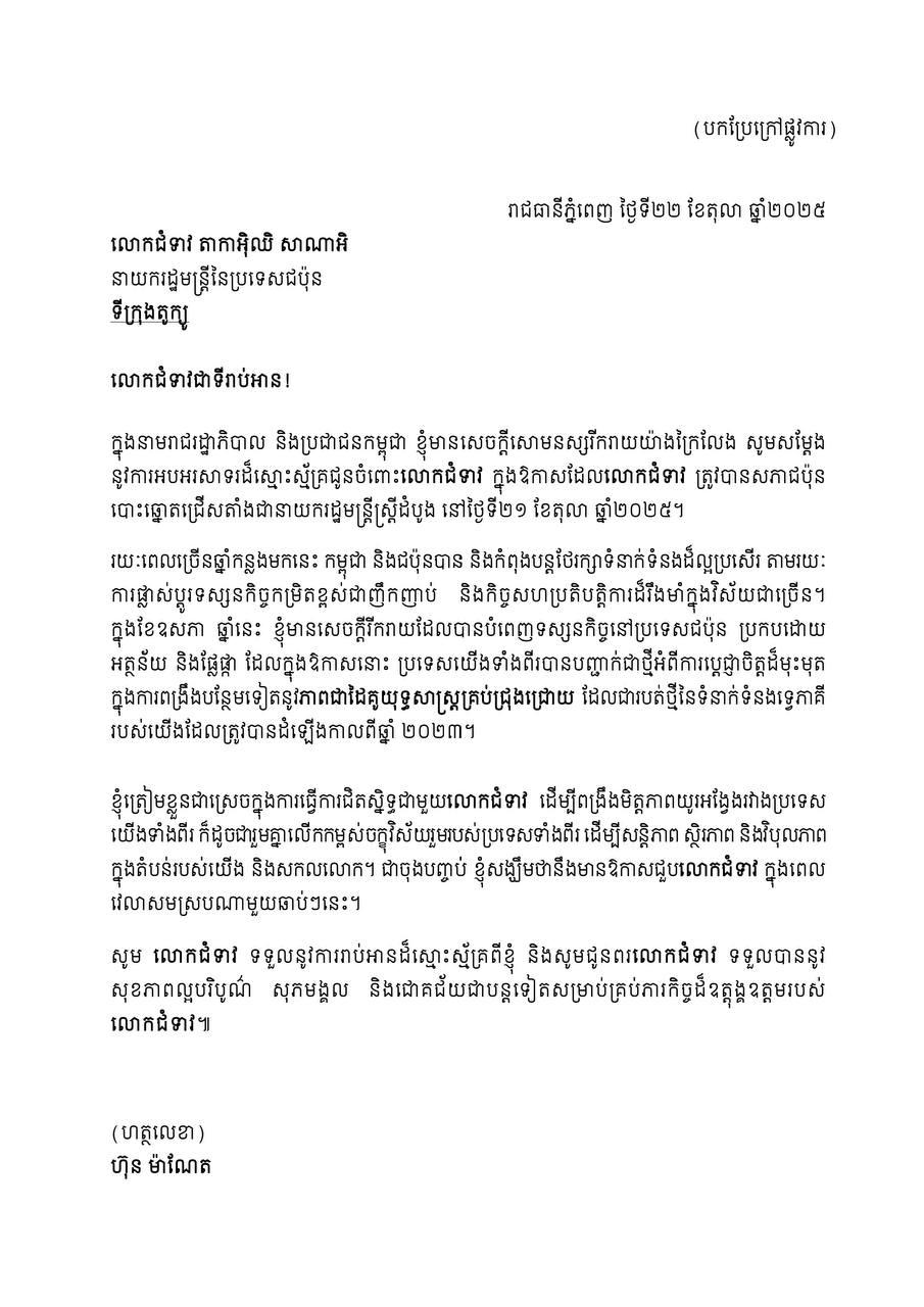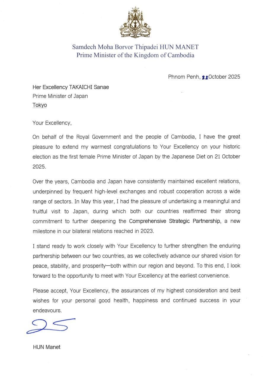 តាមសារលិខិតអបអរសាទរជូនចំពោះ លោកស្រី TAKAICHI Sanae ត្រូវបានជ្រើសតាំងជា នាយករដ្ឋមន្ត្រី នៃប្រទេសជប៉ុន, សម្ដេចធិបតី ហ៊ុន ម៉ាណែត បានសម្តែង នូវការអបអរសាទរដ៏ស្មោះស្ម័គ្រជូនចំពោះលោកស្រី ក្នុងឱកាស ត្រូវបានសភាជប៉ុន បោះឆ្នោតជ្រើសតាំងជានាយករដ្ឋមន្ត្រីស្ត្រីដំបូង នៅថ្ងៃទី២១ ខែតុលា ឆ្នាំ២០២៥។