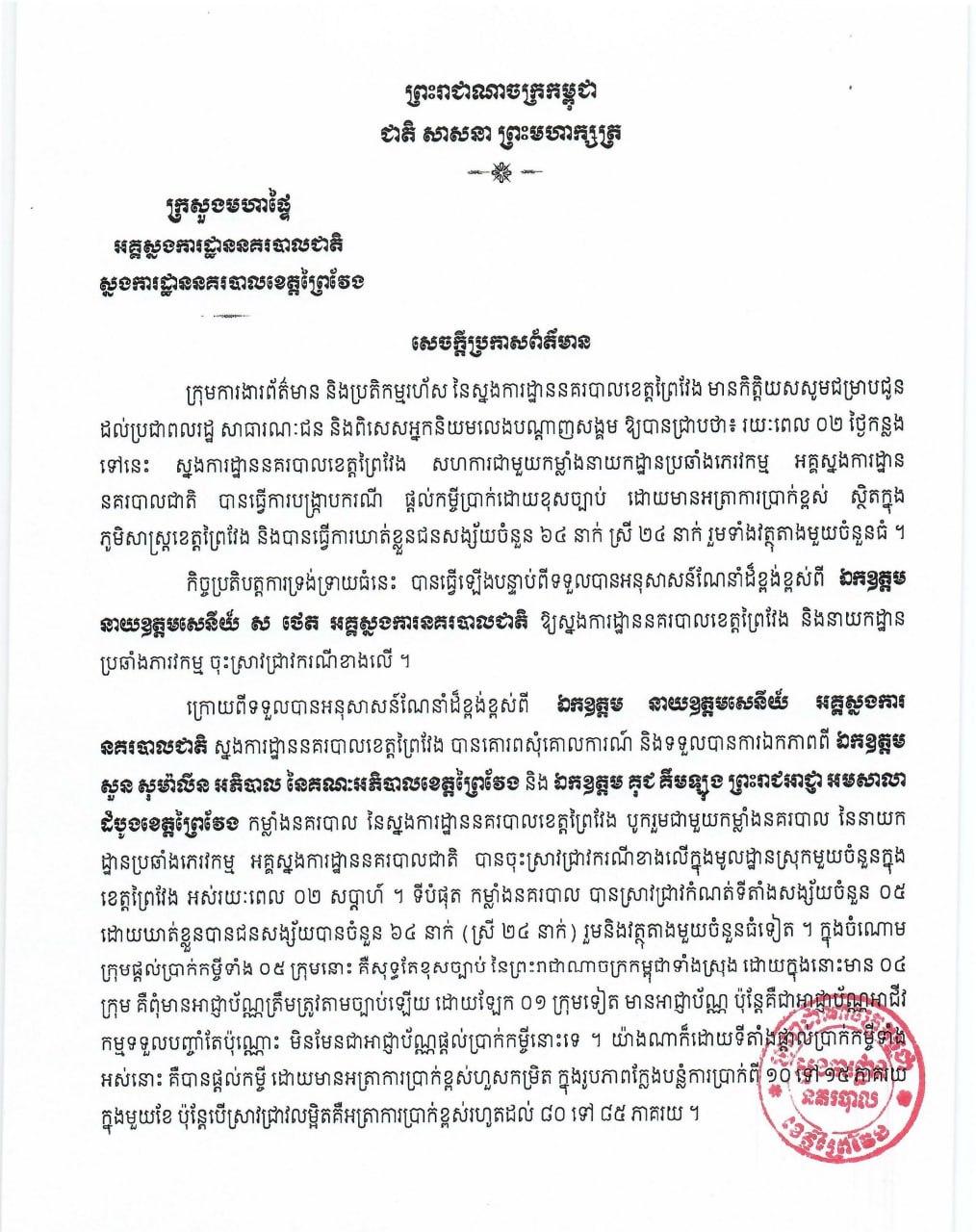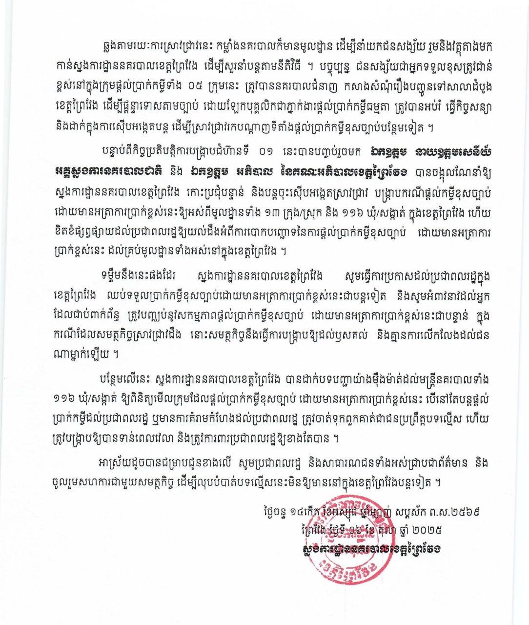 ភ្នំពេញ ៖ ស្នងការដ្ឋាននគរបាលខេត្តព្រៃវែង នៅថ្ងៃទី៦ ខែតុលា ឆ្នាំ២០២៥នេះ បានចេញសេចក្ដីប្រកាសព័ត៌មាន ស្ដីពីប្រតិបត្តិការបង្ក្រាបករណី ផ្ដល់កម្ចីប្រាក់ដោយខុសច្បាប់ ដោយមានអត្រាការប្រាក់ខ្ពស់ បានធ្វើការឃាត់ខ្លួនជនសង្ស័យចំនួន ៦៤ នាក់ រួមទាំងវត្ថុតាងមួយចំនួនធំ ។