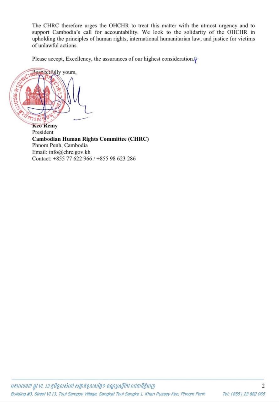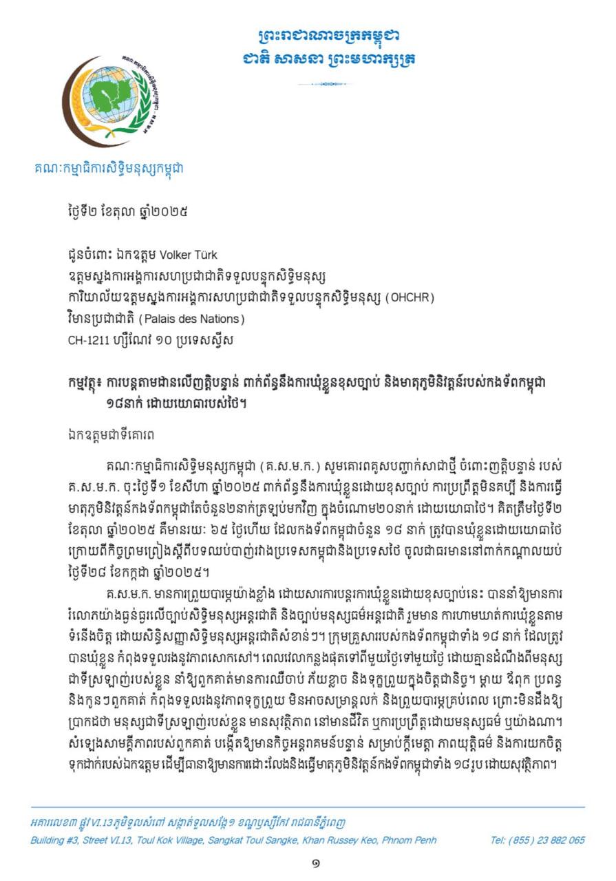 គណៈកម្មាធិការសិទ្ធិមនុស្សកម្ពុជា (គ.ស.ម.ក.) គូសបញ្ជាក់សាជាថ្មី ចំពោះញត្តិបន្ទាន់ របស់ គ.ស.ម.ក. ចុះថ្ងៃទី១ ខែសីហា ឆ្នាំ២០២៥ ពាក់ព័ន្ធនឹងការឃុំខ្លួនដោយខុសច្បាប់ ការប្រព្រឹត្តមិនគប្បី និងការធ្វើ មាតុភូមិនិវត្តន៍កងទ័ពកម្ពុជាតែចំនួន២នាក់ត្រឡប់មកវិញ ក្នុងចំណោម២០នាក់ ដោយយោធាថៃ។