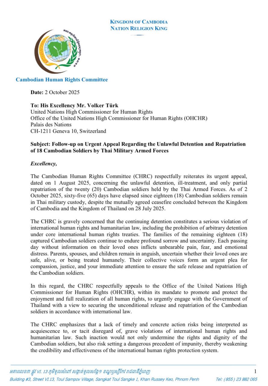 ភ្នំពេញ ៖ នៅថ្ងៃទី២ ខែតុលា ឆ្នាំ២០២៥នេះ គណៈកម្មាធិការសិទ្ធិមនុស្សកម្ពុជា (គ.ស.ម.ក.) ដាក់ញ្ញត្តិបន្ទាន់ លើកទី២ ដើម្បីជំរុញឱ្យមានការដោះលែងកងទ័ពកម្ពុជាទាំង ១៨ នាក់ ហើយគិតត្រឹមថ្ងៃទី២ ខែតុលា ឆ្នាំ២០២៥ គឺមានរយៈ ៦៥ ថ្ងៃហើយ ដែលកងទ័ពកម្ពុជាចំនួន ១៨ នាក់ ត្រូវបានឃុំខ្លួនដោយយោធាថៃ។