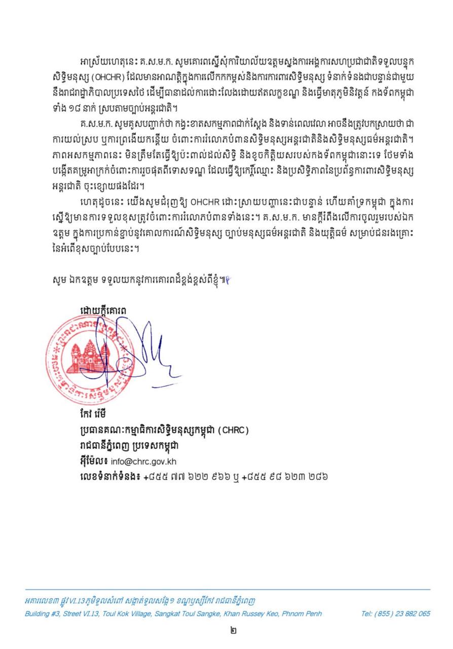 គណៈកម្មាធិការសិទ្ធិមនុស្សកម្ពុជា ដាក់ញ្ញត្តិបន្ទាន់ លើកទី២ ដើម្បីជំរុញឱ្យមានការដោះលែងកងទ័ពកម្ពុជាទាំង ១៨នាក់ ត្រូវបានឃុំខ្លួនដោយយោធាថៃ