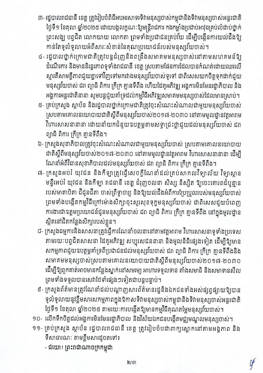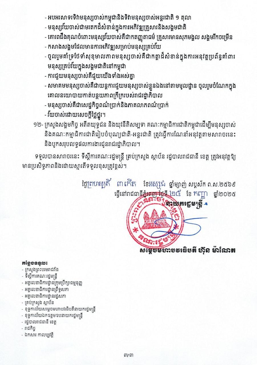 លើសពីនេះ សម្ដេច នាយករដ្ឋមន្ដ្រី ក៏បានណែនាំក្រសួងអប់រំ យុវជន និងកីឡា ត្រូវធ្វើសេចក្តីណែនាំដល់គ្រប់សាកលវិទ្យាល័យ មន្ទីរអប់រំ យុវជន និងកីឡា រាជធានី ខេត្ត ជំរុញចលនា សិស្ស និស្សិត ឱ្យចេះគោរពដំបូន្មាន របស់មាតាបិតា ជីដូនជីតា ចាស់ព្រឹទ្ធាចារ្យ និងឱ្យយល់ដឹងអំពីការប្រែប្រួលរបស់មនុស្សវ័យចាស់ ព្រមទាំងបង្កើតកម្មវិធីក្រៅម៉ោងសិក្សាចុះសួរសុខទុក្ខមនុស្សវ័យចាស់ វិទ្យាស្ថាន ជាពិសេសជួយបំពេញ ការងារជាឧត្តមប្រយោជន៍ជូនមនុស្សវ័យចាស់ ជរា ព្យាធិ ពិការ ក្រីក្រ គ្មានទីពឹង នៅក្នុងមូលដ្ឋាន ស្ថិតនៅជិតកន្លែងសិក្សារបស់ខ្លួន៕