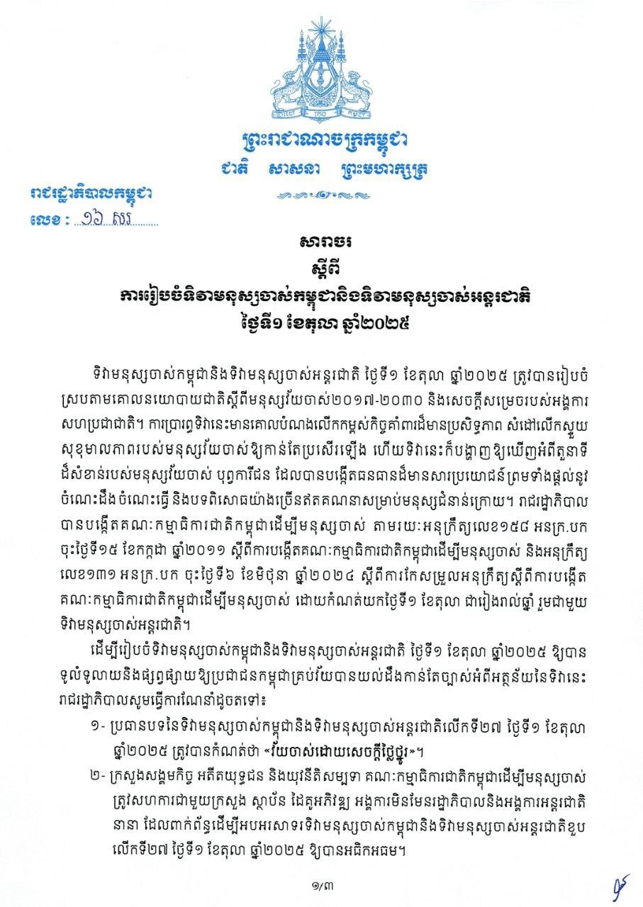 តាមរយៈសារាចរណែនាំស្ដីពី ការរៀបចំទិវាមនុស្សចាស់កម្ពុជា និងទិវាមនុស្សចាស់អន្តរជាតិ ថ្ងៃទី១ ខែតុលា ឆ្នាំ២០២៥ សម្តេចធិបតី ហ៊ុន ម៉ាណែត បានគូសបញ្ជាក់ថា «រដ្ឋបាលថ្នាក់ក្រោមជាតិត្រូវបន្តជំរុញ និងពង្រឹងសមាគមមនុស្សចាស់នៅតាមសហគមន៍ ដំណើរការ និងមាននិរន្តរភាពទូទាំងរាជធានី ខេត្ត ស្របតាមផែនការដែលបានកំណត់ដោយឈរលើ ស្មារតីសាមគ្គីភាពជួយគ្នាទៅវិញទៅមករវាងមនុស្សវ័យចាស់ទូទៅ ជាពិសេសយកចិត្តទុកដាក់ជួយ មនុស្សវ័យចាស់ ជរា ព្យាធិ ពិការ ក្រីក្រ គ្មានទីពឹង ហើយដៃគូអភិវឌ្ឍ អង្គការមិនមែនរដ្ឋាភិបាល និង អង្គការអន្តរជាតិនានា បន្តជួយគាំទ្រដល់កម្មវិធីអភិវឌ្ឍសមាគមមនុស្សចាស់ដែលមានស្រាប់»។