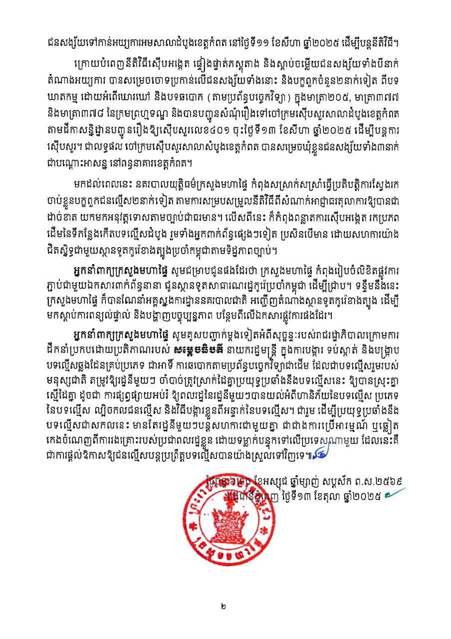 ក្រោយពីការប្រមូលភស្តុតាង ការស្តាប់ចម្លើយជនសង្ស័យ ការបំពេញកិច្ចការជំនាញស្របតាមនីតិវិធី កំណត់ដោយច្បាប់ នគរបាលយុត្តិធម៌ បានកសាងសំណុំរឿងយ៉ាងមូល និងគ្រប់ជ្រុងជ្រោយ ព្រមទាំងបញ្ជូនជនសង្ស័យទៅកាន់អយ្យការអមសាលាដំបូងខេត្តកំពត នៅថ្ងៃទី១១ ខែសីហា ឆ្នាំ២០២៥ ដើម្បីបន្តនីតិវិធី។