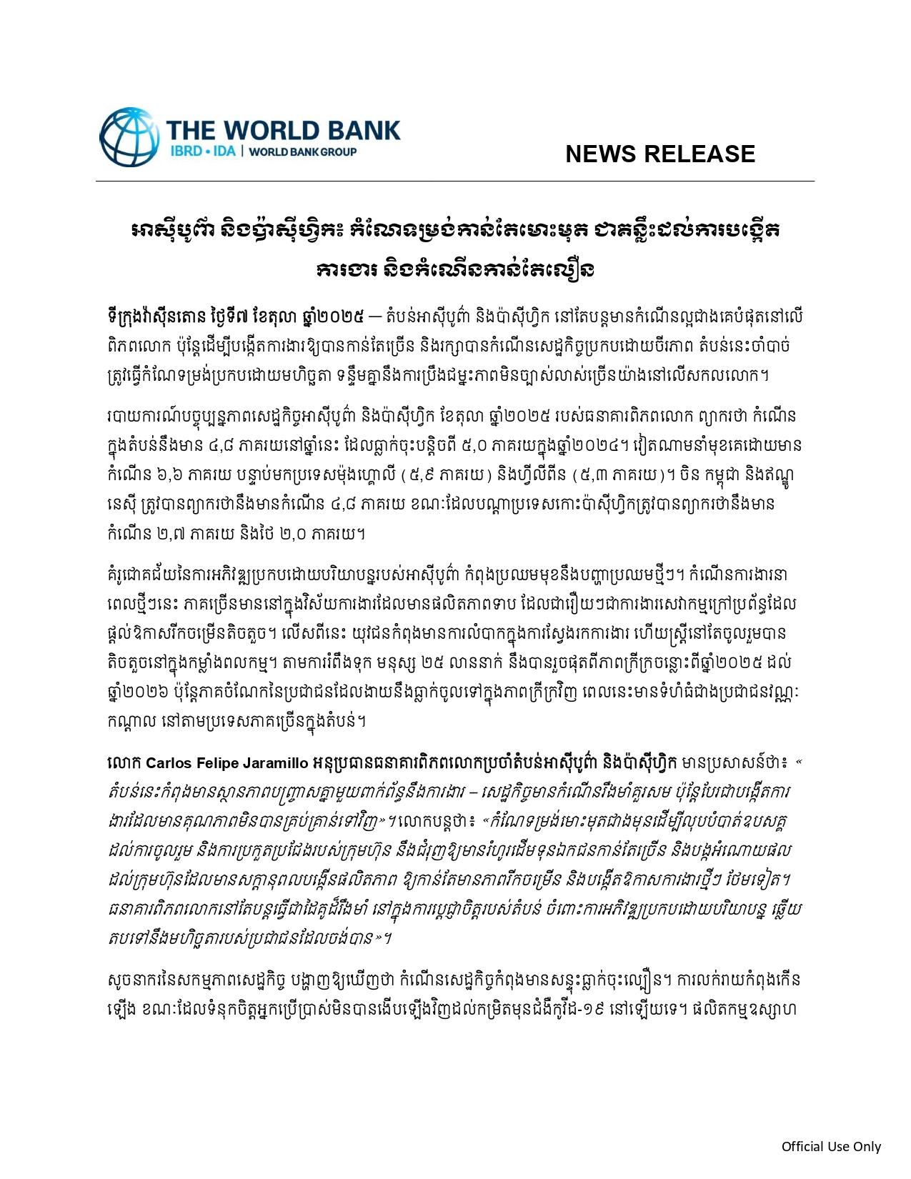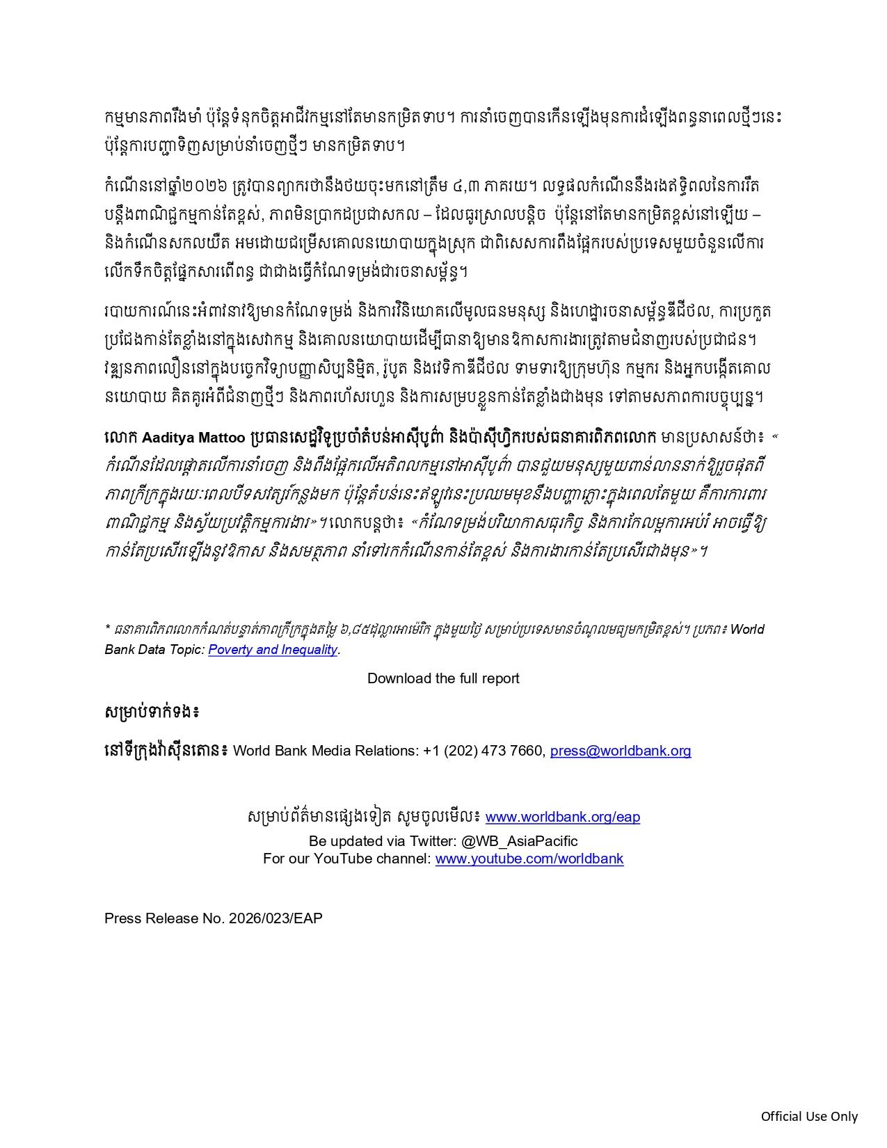 ក្នុងរបាយការណ៍ថ្មីរបស់ធនាគារពិភពលោក បានបញ្ជាក់យ៉ាងដូច្នេះថា «ចិន កម្ពុជា និងឥណ្ឌូ នេស៊ី ត្រូវបានព្យាករថា នឹងមានកំណើន៤.៨ភាគរយ ខណៈដែលបណ្តាប្រទេសកោះប៉ាស៊ីហ្វិក ត្រូវបានព្យាករថា នឹងមានកំណើន២.៧ភាគរយ និងថៃ២.០ភាគរយ»។