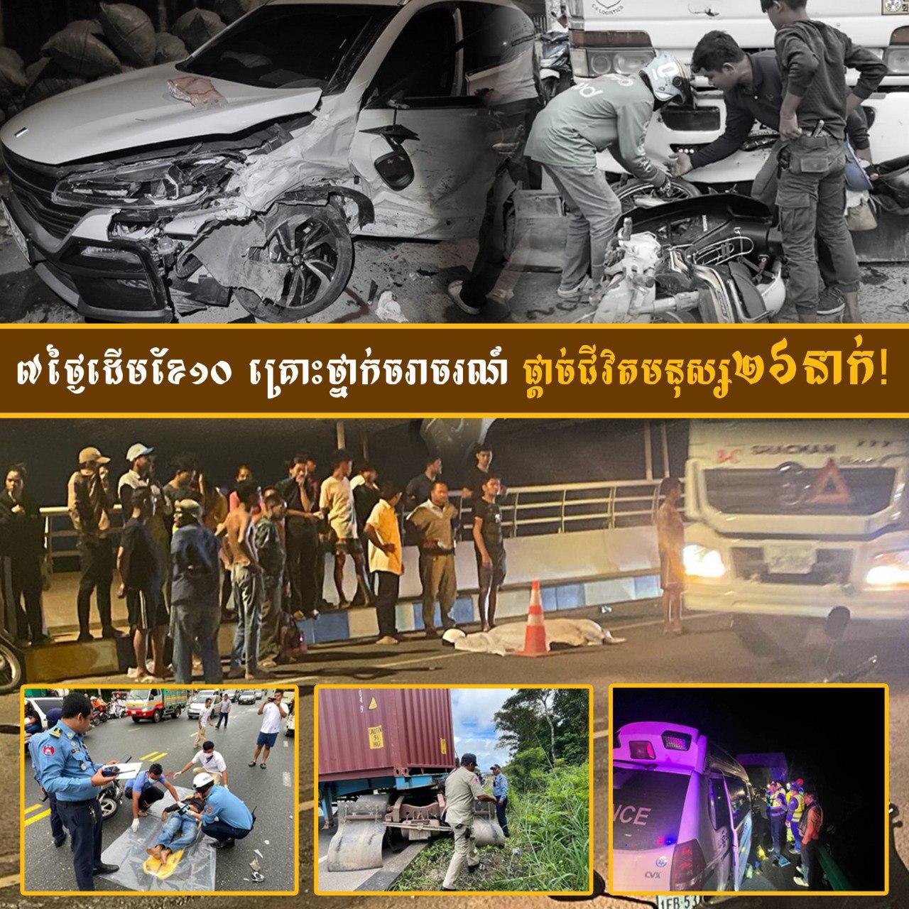 ភ្នំពេញ ៖ ក្នុងរយៈពេល៧ថ្ងៃ គិតចាប់ពីថ្ងៃទី១ រហូតដល់ថ្ងៃទី៧ ខែតុលា ឆ្នាំ២០២៥ នេះ មានហេតុការណ៍គ្រោះថ្នាក់ចរាចរណ៍ផ្លូវគោកនៅទូទាំងប្រទេស បន្តកើតឡើងចំនួន៣៦ករណី បណ្តាលឱ្យមានមនុស្សស្លាប់ចំនួន ២៦នាក់ និងរងរបួសធ្ងន់ស្រាលចំនួន៤៦នាក់។ នេះបើតាមលោក ទូច សុឃៈ អ្នកនាំពាក្យរងក្រសួងមហាផ្ទៃ។