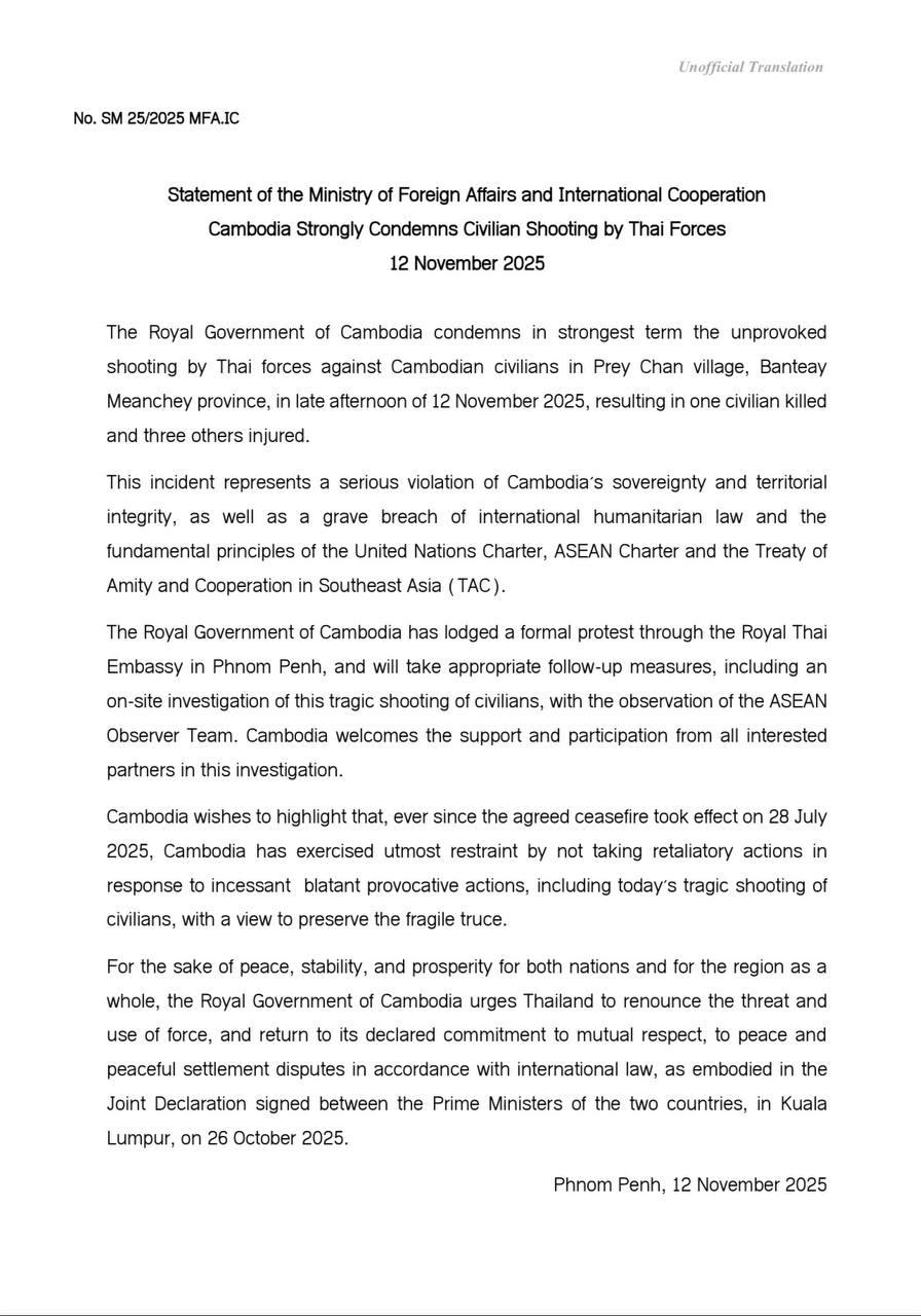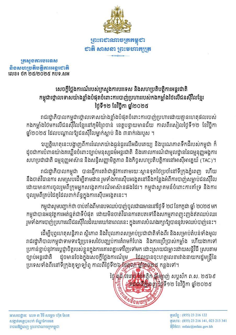 យោងតាមសេចក្តីថ្លែងការណ៍ របស់ក្រសួងការបរទេស និងសហប្រតិបត្តិការអន្តរជាតិកម្ពុជា នៅថ្ងៃទី១២ ខែវិច្ឆិកា ឆ្នាំ២០២៥ បានឲ្យដឹងថា រាជរដ្ឋាភិបាលកម្ពុជា ថ្កោលទោសយ៉ាងខ្លាំងបំផុតចំពោះការបាញ់ប្រហារដោយគ្មានហេតុផលរបស់ កងកម្លាំងថៃមកលើជនស៊ីវិលខ្មែរនៅភូមិព្រៃចាន់ ខេត្តបន្ទាយមានជ័យ កាលពីរសៀលថ្ងៃទី១២ ខែវិច្ឆិកា ឆ្នាំ២០២៥ បណ្តាលឲ្យជនស៊ីវិលម្នាក់ស្លាប់ និង ៣នាក់រងរបួស។